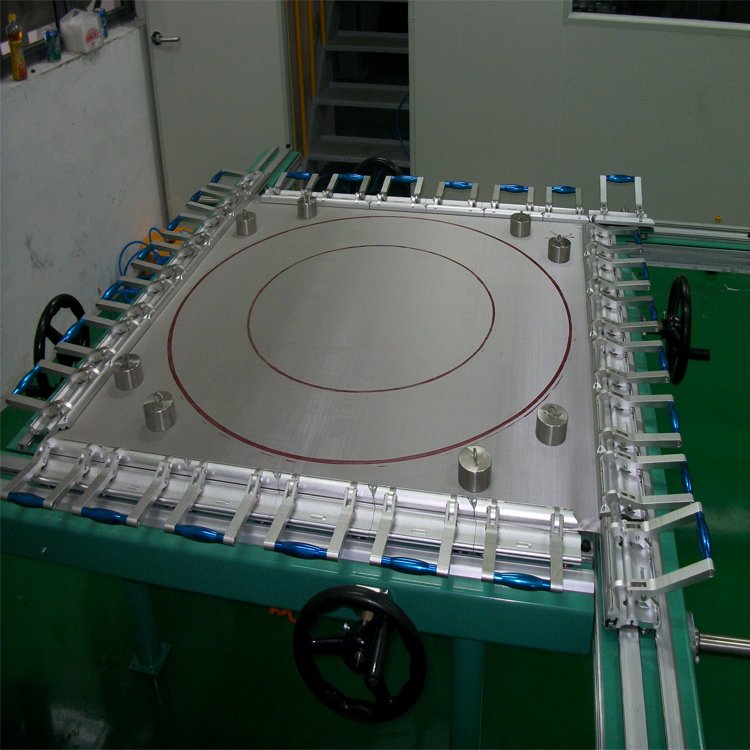 4.拉平网纱,用网夹固定好网纱的边缘,再慢慢旋转机上四边的手轮,使网纱慢慢处于张紧状态,如此反复,直到网纱的各处的张力大致相等为止,张力的大小概括网纱的目数和质地而定,网张好后用张力计进行检查,注意:网纱拉力不能一次拉到位,须分开几次,比如:拉网力要求40N,先拉到15N,经过只少5分钟的停留后,才拉到20N如此反复拉网才可.
